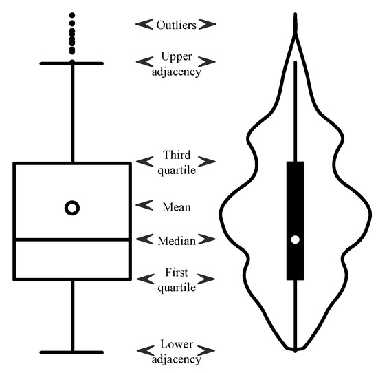 In Figure 5, the violin plot is a combination of a box plot and a kernel density plot, providing us with a way to identify outliers. The white dots on the violin plot represent the median, the thick black bars represent the interquartile range, and the narrow black bars represent the upper and lower adjacencies. Furthermore, the shape of the violin plot shows the overall distribution of the data, which is similar to the results of the frequency distribution histogram. The differences between the specific violin and box plots are shown in Figure 6.