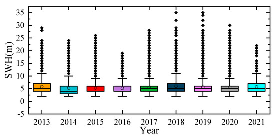 From Figure 6, the violin and box plots give similar information, with the box plot giving additional mean values and the violin plot giving additional information on the distribution of the data. Although normally for machine learning values above the upper and lower adjacency can be considered as outliers and discarded. However, due to the non-linear and non-stationary nature of the SWH data, the volatility is much more dramatic than in normal statistics. The upper bound amplitude is much higher than the upper adjacency of the common statistical range and is real. It is very unjustified to simply discard some data in a crude manner. Therefore, a novel filter formulation for SWH outliers is proposed in this paper by manually checking the measured data from ShiDao monitoring station to remove the missing and extreme outlier values. The box plot of SWH effective data over the years is shown in Figure 7.