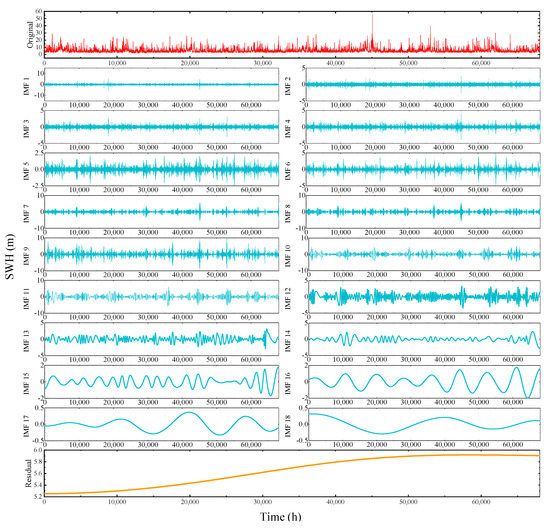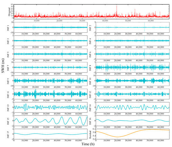 Figure 8 and Figure 9 show the SWH time history data after processing by EMD and CEEMDAN. There are eighteen IMFs and one residual for EMD and seventeen IMFs and one residual for CEEMDAN. For the ShiDao effective data, we can obtain some conclusions from Figure 8 and Figure 9.