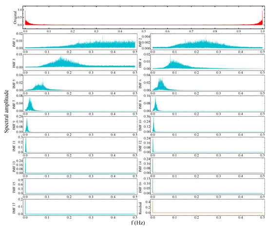 The results of the IMFs obtained by EMD and CEEMDAN for the ShiDao effective data in the frequency domain are shown in Figure 10 and Figure 11.