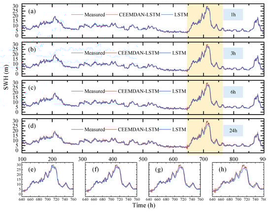 Although LSTM, as a particular type of RNN, has been widely used for time series prediction due to its powerful ability to selectively remember and forget information. However, LSTM, like all methods, is limited by its mathematical basis and the inability of science to fully observe physical phenomena. Therefore, it is necessary to add other tools. In this paper, we test the LSTM and integrated CEEMDAN-LSTM models with SWH effective data obtained from the ShiDao monitoring station off the east coast of China using the National Marine Data Center, National Science and Technology Resource Sharing Service Platform of China. The first 90% of the dataset was classified as the training set and the last 10% was classified as the test set. For the ShiDao effective dataset, there were 61,252 and 6806 data, respectively. The model uses a rolling mechanism to iteratively predict n future values from the input data (n = 1,3,6,24 corresponding to 1, 3, 6 and 24 h ahead, respectively). The real SWH data from the next iteration step is then used as the known input to the model to continue the prediction with a rolling forecast. Due to the large amount of data, overfitting is less likely to occur. However, in order to increase the applicability of the model and further reduce the possibility of overfitting, a dropout layer was set up with 50% random discarding used to prevent overfitting [48].