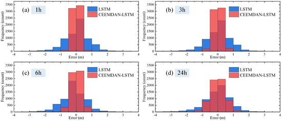 As the forecast duration progresses (as shown in Figure 13a–d, where forecast errors are given for 1-, 3-, 6- and 24-h windows in turn), the forecast errors for both methods gradually increase. The error distribution of the LSTM shows a normal distribution, although these errors are generally concentrated between ±2 m and especially between ±0.5 m. However, it is clear that the frequency of ±0.5 m errors also decreases with time. This implies that the LSTM prediction effect rapidly diminishes with forecast duration. Unlike the normal distribution of LSTM, the distribution of CEEMDAN-LSTM forecast errors is more concentrated and is around ±0.5 m in Figure 13a–c. The number of CEEMDAN-LSTM errors greater than ±0.5 m under a Figure 13d forecast duration of 24 h is also much smaller than that of LSTM. This shows that the integrated CEEMDAN-LSTM joint model not only has a significantly higher prediction accuracy than the LSTM, but also performs better in terms of the distribution of cumulative errors.