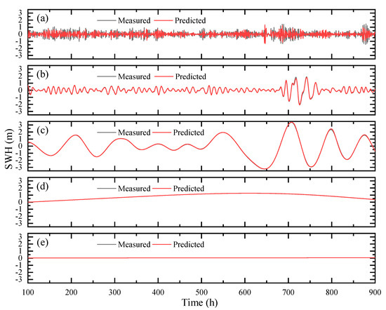 Comparison of measured (black) and CEEMDAN-LSTM predicted (red) values with SWH forecasts of (a) IMF1, (b) IMF5, (c) IMF9, (d) IMF13 and (e) IMF17 in 1-h window.