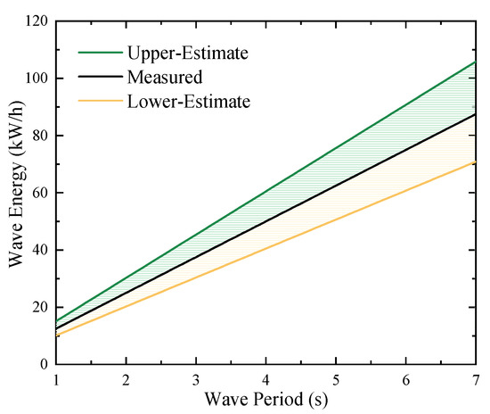 Figure 15 provides an example of a wave energy estimate. Here, the SWH measured values (black) are 5 m, the wave period is 2–6 s and the upper-estimate and lower-estimate offsets are about 0.5 m.