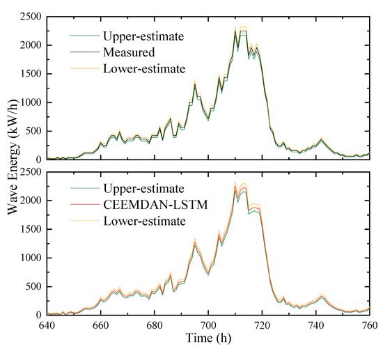 Wave energy estimate results of upper-estimate (green) and lower-estimate (yellow) of CEEMDAN-LSTM prediction (red) in comparison with measured values (black) in 5-s wave period.