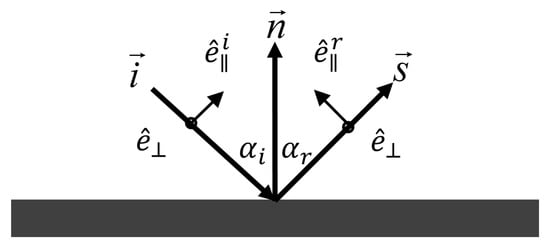 According to the physical optics method, as shown in Figure 3, there is a relationship between the incident and the scattered wave for large dielectric targets [33]. Where is the incident angle of the incident wave, and and are the vector directions of the incident and reflection electric fields of horizontally polarized waves. For vertically polarized incident waves, is the vector direction of the incident and reflection electric fields. According to the local coordinate system, as shown in Figure 2, the following relationship can be obtained [41].