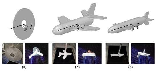 Figure 4 shows three typical targets used in the EM and acoustic scattering simulation and measurement. Figure 4a is a metal plate that can be used as a rigid body in the measurement of acoustic scattering. Because the wave impedance of resin material is similar to that of water, as shown in Figure 4b,c, the aircraft and submarine models with a thin resin shell can be selected as soft targets. In the measurement of EM scattering, as shown in Figure 4b,c, the targets are covered with metal, i.e., an electrically conducting material.
