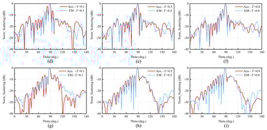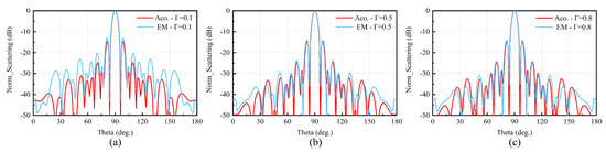 Due to the major difficulty in the fabrication of impedance materials, only the simulation result is used in the similarity verification of EM scattering by dielectrics and acoustic scattering by elastomers. As shown in Figure 4 and Table 1, the reflectivity is set to 0.1, 0.5, and 0.8, which corresponds to impedance ratios , 1/3, and 1/9. The simulation results of EM scattering and acoustic scattering with different boundary conditions are shown in Figure 6. It can be found that all of the EM scattering and acoustic scattering results have a very good agreement with different boundary impedances. The maximum scattering direction, the width of the main lobe, and the two scattering curves have a perfect agreement. The correlation coefficients of the two scattering curves are greater than 0.96 and are highly correlated. Furthermore, two kinds of scattering curves are more consistent with a more simple structure, larger aperture, and higher reflectivity. Note that different software is used in the simulation of EM scattering and acoustic scattering. Above all, the results in Figure 6 illustrate similar characteristics of EM and acoustic scattering with different boundary conditions.