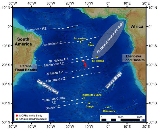 The South Atlantic is located between Africa and South America (Figure 1), with Olavtoppen Island at the southernmost end and Romanche Trench at the northernmost end, which gradually opened from south to north during the breakup of west Gondwana from ~134 Ma [25,26]. There are several hotspots in the South Atlantic including Ascension, Circe, St. Helena, Tristan, Discovery, and Shona (yellow circles in Figure 1), among which St. Helena is closest to the study area. The St. Helena hotspot is linked by the St. Helena seamount chain to West Africa, but there is no corresponding continent flood basalt [27] (Figure 1). Geochemically, St. Helena is a mantle plume with typical HIMU mantle end-member characteristics. Mantle plumes in the South Atlantic have extensive effects on different ridge segments of SMAR [28,29,30], and are associated with the breakup of Gondwana [31].
