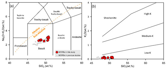 (a) Total alkali vs. SiO2 diagram. The alkaline-subalkaline discrimination line is from [37]. (b) K2O vs. SiO2 diagram. The discrimination lines are from [38]. The red and gray circles represent the SMAR basalts in this study and in previous studies [26,32,39], respectively. Primitive mantle and N-MORB data are from [40].
