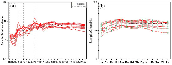 (a) Primitive mantle-normalized trace element patterns for the analyzed samples. (b) Chondrite-normalized trace element patterns for the analyzed samples. Primitive mantle, chondrite, and N-MORB data are from [40].