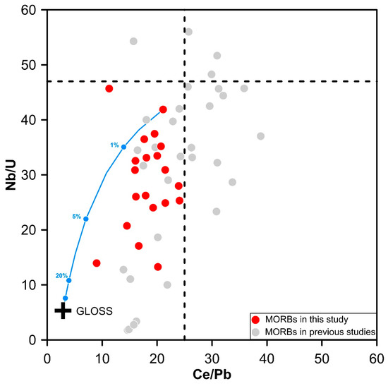Ce/Pb and Nb/U ratios are relatively uniform in MORBs worldwide [13,24] at 25 ± 5 and 47 ± 10 (black dashed lines in Figure 5; [45]), respectively. However, Ce/Pb and Nb/U ratios in our samples vary widely (Figure 5), with an average value of 18 and 29, respectively. Figure 5 shows that regardless of the degree of depletion, Ce/Pb and Nb/U ratios of our samples are lower than the corresponding values (25 for Ce/Pb, 47 for Nb/U), with the lowest values of 9 and 13, respectively, which corresponds to the clear enrichment of U and Pb in the samples. In general, Ce/Pb ratio is positively correlated with Nb/U ratio (correlation coefficient is 0.63).