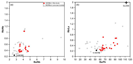 Plots of (a) Ba/NB vs. Rb/Nb. (b) Ba/Th-Rb/La. Red dots represent new MORBs in this study and gray dots represent SMAR 18–21°S MORBs in [26,32,39]. Black square represents the typical N-MORB, the composition of which is from [40]. Black cross represents global subducting sediment (GLOSS), the composition of which is from [41].