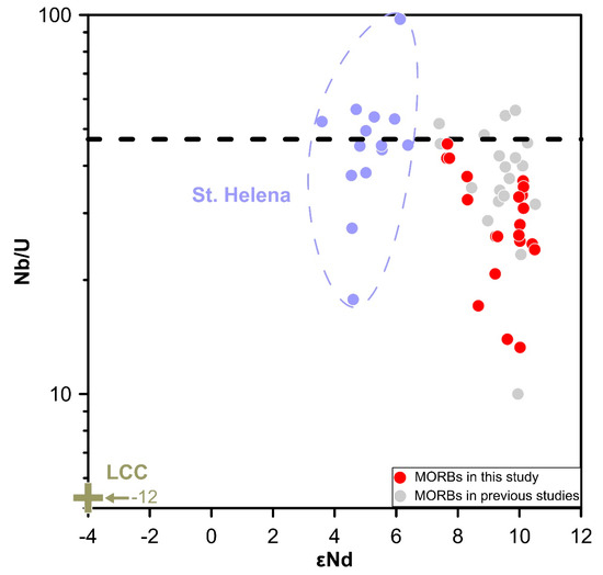 Le Roux et al. [51] proposed that some anomalies of trace elements in MORBs were caused by the direct supply of adjacent plume materials. If the anomalies of trace elements in this study are caused by the direct supply of plume materials, the basalts produced by the mantle plume should generally have low Ce/Pb and Nb/U ratios. However, Figure 7 shows that only few St. Helena basalts have a low Nb/U ratio, while most have a constant Nb/U ratio typical of oceanic basalts, with an average Nb/U ratio of 44, which is consistent with previous studies [13,23,24]. The injection of plume materials cannot reduce the Nb/U ratio of source mantle. Moreover, suppose that the direct supply of plume materials really is the origin of the trace element anomalies, the abnormal trace element ratios should be related to the isotopes. Namely, the more radioactive the isotopic composition of MORB is, the more clear the abnormal ratio of the trace elements will be. However, the correlation between the ratio of trace elements and isotopic composition is not clear (Figure 8). Therefore, the direct supply of St. Helena material does not result in the abnormal trace element ratios.