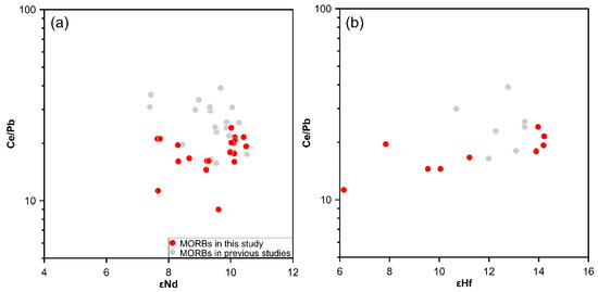 Plots of (a) εNd (b) εHf vs. Nb/U. Red dots represent new MORBs in this study and gray dots represent SMAR 18–21°S MORBs in [26,32].