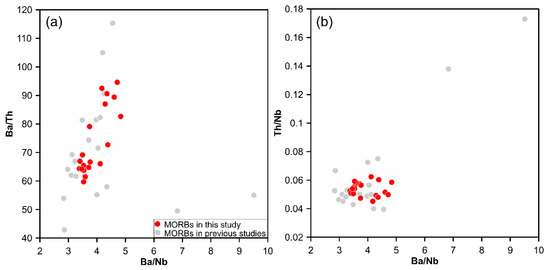 Plots of Ba/Nb vs. (a) Ba/Th (b) Th/Nb. Red dots represent new MORBs in this study and gray dots represent SMAR 18–21°S MORBs in [26,32].