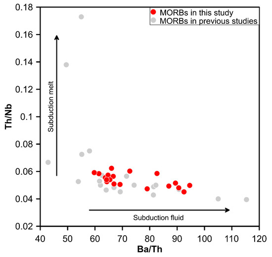 Plots of Ba/Th vs. Th/Nb. Red dots represent new MORBs in this study and gray dots represent SMAR 18–21°S MORBs in [26,32].