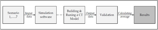 The simulation process began by creating a basic container terminal model based on real data (Scenario 1). The annual throughput of the base version of the terminal is 630,000 TEU per year. After the simulation runs, the obtained outputs were reviewed and evaluated, and later the final results were obtained. Since the goal was to accommodate larger vessels in a smaller terminal and thus increase annual throughput, the capacity and traffic of the base model were increased (Scenario 2). The simulations were run again and new results emerged. Thus, the model’s traffic was increased with larger PP services and the terminal’s capacity was increased until an annual throughput of 1 million TEUs was reached. The simulation process is shown in Figure 2.