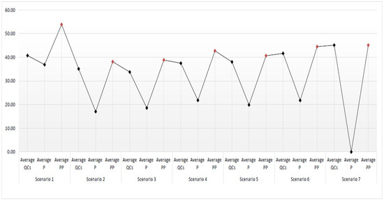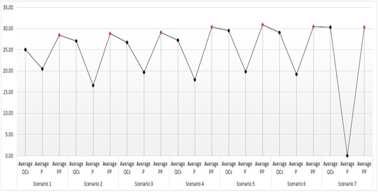 QC working time (%). The average working time for P and for PP QCs separately, and the average working time for all eight QCs together in all 7 simulated scenarios.