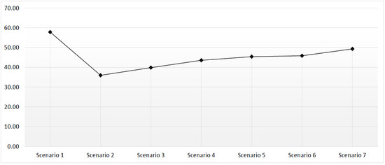 This means that the performance of the QCs did not exceed the maximum utilisation rate, which had an extremely positive effect on the length of time ships stayed at the terminal and consequently on the berth occupancy rate. This must be kept as low as possible if the terminal is to increase its traffic and accommodate new services. It ranged from 36% to 58% in all scenarios. The highest value was recorded in scenario 1, which is understandable given the short quay length and traffic volume. The results were particularly good in the last scenarios, when the terminal had the highest number of PP ships and a traffic volume close to 1 million TEU. In this case, the berth occupancy rate did not exceed 50%, which means that there is still room to increase traffic at the terminal without causing overcrowding and lowering the operating level, which would be a concern if the occupancy rate exceeded 65%.