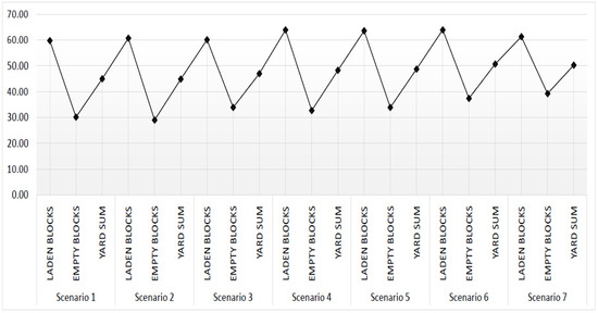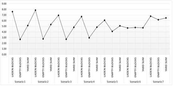 The utilisation rate of the yard area gradually increased with the increase in terminal traffic. It reached its highest percentage in scenarios 6 and 7, when it averaged 50%. The highest percentage, which was already close to the critical limit of the recommended level (65%), was observed in the full container blocks from scenario 4, when the traffic volume increased to 844,000 TEUs and more. At that time, the percentage was between 61% and 64%, which could lead to congestion problems and lower productivity in the yard and consequently at the berth if the traffic volume continued to increase and the storage area was not optimised. No problems were identified with the empty container blocks, as utilisation did not exceed 40% even in scenario 7, when terminal throughput was nearly 1 million TEUs.