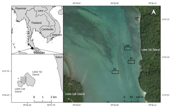Study site at Lidee Islands, Mu Ko Phetra National Park, in the Andaman Sea, Satun Province. SW: seaweed habitat; SG: seagrass habitat; BS: bare sand habitat.