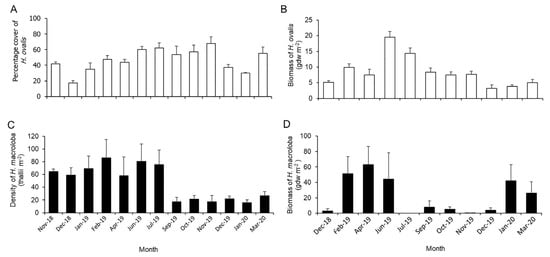 Abundance of macrophyte (mean ± SE) from November 2018 to March 2020 except March, May, and August 2019, and February 2020, and biomass of macrophytes (mean ± SE) from December 2018 to March 2020 except January, March, May, and August 2019, and February 2020: (A) percentage cover of H. ovalis in seagrass habitat; (B) aboveground biomass of H. ovalis in seagrass habitat; (C) density of H. macroloba in seaweed habitat and (D) aboveground biomass of H. macroloba in seaweed habitat.