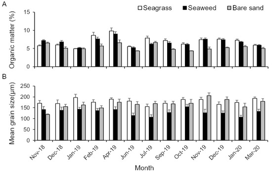 Properties of sediment (mean ± SE): (A) organic matter and (B) grain size in seagrass, seaweed, and bare sand habitats from November 2018 to March 2020.