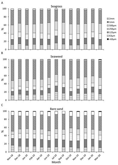 Distribution of sediment size (mean ± SE) in (A) seagrass; (B) seaweed; and (C) bare sand habitats from November 2018 to March 2020.