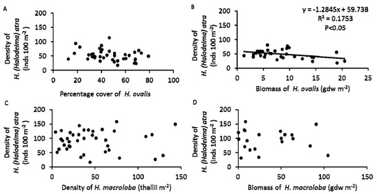 The density of H. atra was not significantly correlated with the percentage cover of H. ovalis, the density of H. macroloba, and the aboveground biomass of H. macroloba (p > 0.05; Figure 5A,C,D). However, the density of H. atra in the seagrass habitat was significantly negatively correlated with the biomass of H. ovalis (linear regression, Y = −1.28X + 59.74, R2 = 0 18, F1,31 = 6.59, p < 0.05; Figure 5B).