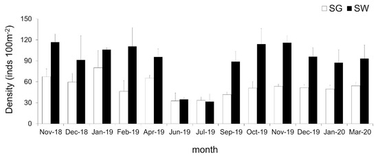 H. atra densities (mean ± SE) in the seagrass (SG) and seaweed (SW) habitats from November 2018 to March 2020.