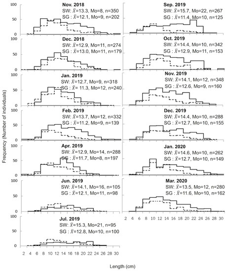 H. atra length-frequency distribution, sampled monthly from November 2018 to March 2020 in seagrass (dash line) and seaweed habitats (solid line).