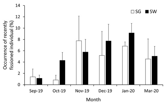 Occurrence of recently fissioned individuals (mean ± SE) in the seagrass habitat (SG) and seaweed habitat (SW), from September 2019 to March 2020.
