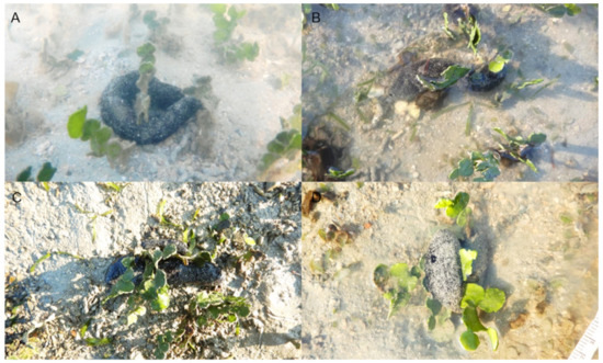In this study site, the sea cucumber was exposed to the air for around 3 h twice a day during the spring tide period. Therefore, the complex structure of H. macroloba can provide the sea cucumber with better protection and shelter from low-tide stress, i.e., high temperature, solar irradiance, and desiccation, than the seagrass habitat and bare sand [22,37,38,39,40,41,42,43,44]. In addition, multiple regression revealed that H. atra density was positively related to seaweed habitat, but negatively related to temperature. Furthermore, we often found H. atra tightly wreathed around H. macroloba by its tube feet (Figure 9A−D). This behaviour might help to stabilize its body firmly against tidal currents that could dislodge it. Thus, H. macroloba presents a more suitable habitat for H. atra and it acts like a pillar for sea cucumbers to attach to (personal observation). Therefore, H. atra might prefer to live in the habitats that provide better protection and shelter from low-tide stress and tidal currents.