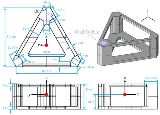 The Taida platform is a three-column delta-shaped semisubmersible floating platform with a characteristic length of 81.6 m, height of 35 m, and draft of 20 m. The column under the turbine is 60% wider than the other two columns with the same size. The total displacement of the system is 23.683 kton. The specifications and dimensions of the Taida platform are shown in Table 1 and Figure 1, respectively.