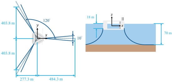 A 3 × 2 mooring design was employed in this study. The mooring line was designed with the following constraints [37]: the allowable offset of the wind turbine system was 30% of the water depth, which was 21 m, to protect the dynamic cables, the anchor weight was preferably less than 18 tons, and the mooring chain was limited to a diameter of 16.51 cm.