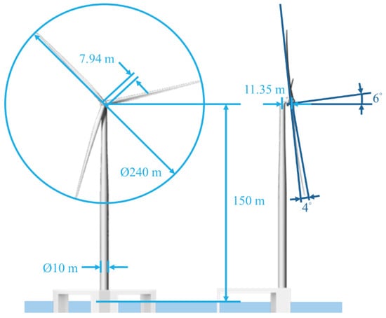 The Taida platform, which was designed to carry a 15 MW wind turbine, was considered the target platform in this study. According to the design constrains of a 15 MW wind turbine system given in [34,36], the characteristic length of the Taida platform is limited to 85 m to fit in the drydock of a potential shipyard in Taiwan for production, and the wind turbine system is limited to a pitch angle between −10° and 10° and a mean pitch angle between −5° and 5° during normal operation.