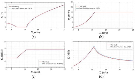 Comparison of (a) blade pitch angle, (b) generator power, (c) rotor speed, and (d) rotor thrust force between this study and [18].