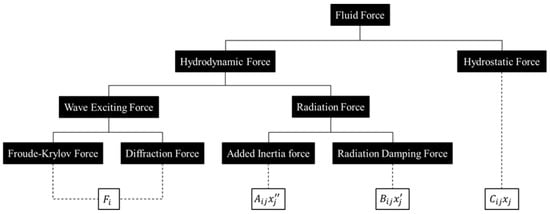 As shown in Figure 6, the fluid force, which is divided into hydrodynamic force and hydrostatic force, is composed of , , , and . The hydrodynamic force is further divided into the wave-exciting force and radiation force. The former, which is a combination of the Froude–Krylov force and diffraction force, is provided by incoming waves under the condition that the floating body is fixed, while the latter, which is a combination of the added inertia force and damping force, is caused by the forced motion of the floating body without considering incoming waves. The Froude–Krylov force on the floating body is introduced by the unsteady pressure field generated by undisturbed waves, while the diffraction force is due to the disturbance of the floating body to the incoming waves.