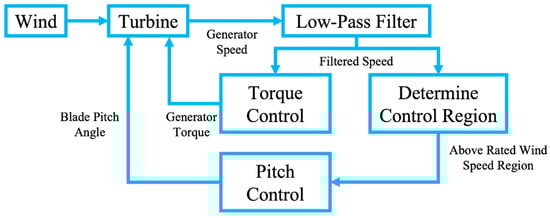 The control system modeling for the wind turbine in OrcaFlex is a proportional integral derivative (PID) controller that is supported through Python [42]. It involves the design of two controllers: the generator torque controller and full-span rotor-collective blade pitch controller. The former is designed for the range below the rated wind speed, while the latter is designed for the range above the rated wind speed. Figure 8 shows the schematic of the employed control system.
