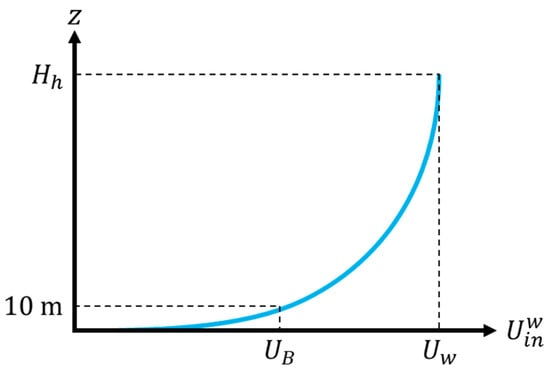The performance of a 15 MW floating wind turbine system using the semisubmersible Taida floating platform equipped with an IEA 15 MW offshore wind turbine predicted via the potential-flow approach (PF approach), which only considers the potential result, and the viscous-flow approach (VF approach), which additionally considers the effects of the viscosity, in the Hsinchu offshore area is presented in this study. The irregular wave conditions discussed in this study correspond to the wave scatter diagram of the Hsinchu offshore area, which is shown in Table 4 [35], in which the significant wave height is and the zero-crossing period is . In this study, the common wave condition (CW condition) (i.e., ) and high wave condition (HW condition) (i.e., ) were both considered. According to [39], the JONSWAP spectrum with was chosen as the wave spectrum. The wind profile (Figure 9) and current profile of an offshore area are defined as follows: