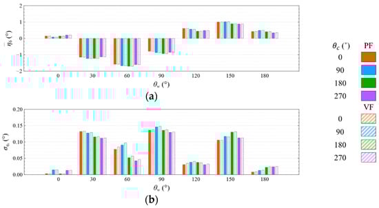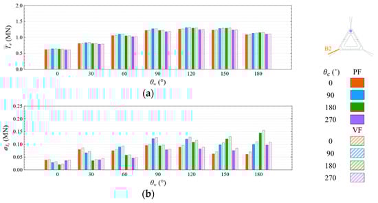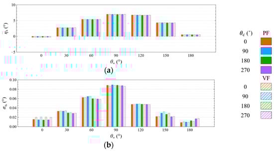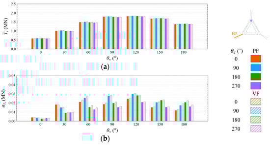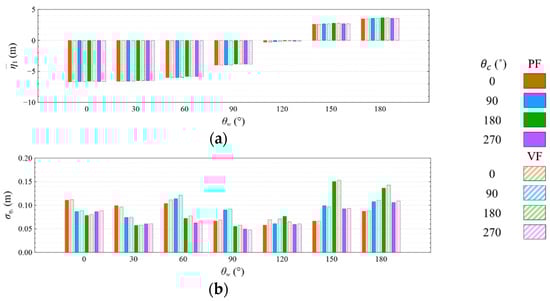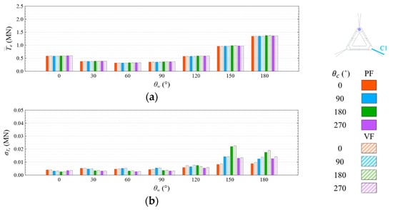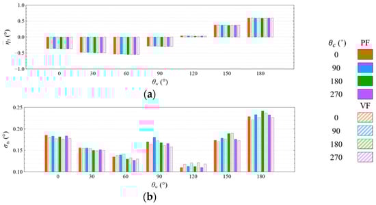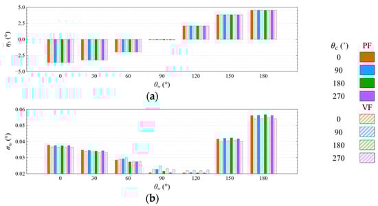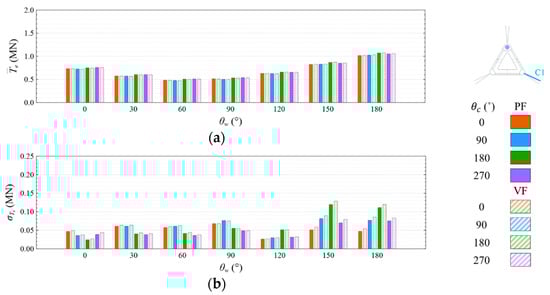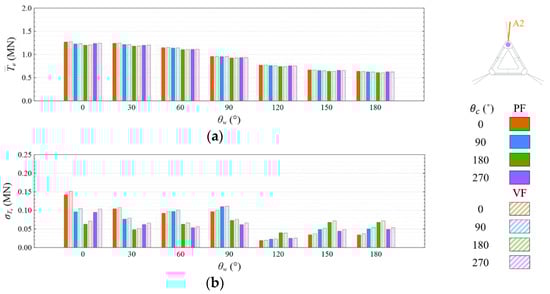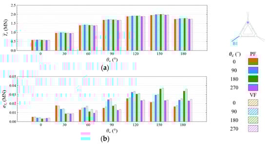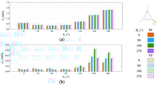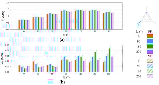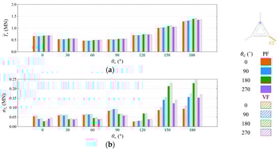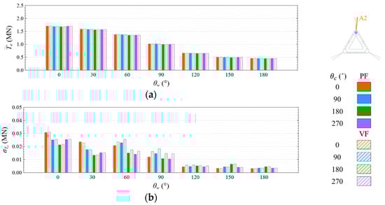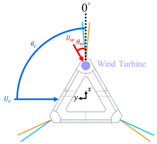 where is the wind velocity at the hub height; is the wind velocity; is the current velocity at the free surface; is the current velocity; is the height above mean sea level; is the hub height of an IEA 15 MW wind turbine (); is the water depth (). The wind velocity obtained from the Beaufort scale () is the wind velocity defined at 10 m above MSL, and the is then calculated via (32). According to [16], the surface current speed () was assumed to be 0.93 m/s, which occurs in the Taiwan Strait with a probability of 75%. The metocean conditions adopted in this study are summarized in Table 5. The waves were assumed to have a direction consistent with the wind. In this study, seven wind and wave directions and four current directions are discussed. The wind, wave, and current directions are defined as the angles measured counterclockwise from the positive -axis to the incoming wind or current directions, as shown in Figure 10.