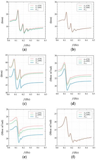 Under the HW condition (), the heave motion has an added mass of around 50 kton, which is the largest among the translation motions, while the surge and sway motions have added masses of around 18 kton and 19 kton, respectively. The roll motion has an added mass of around 21 Mton∙m2/rad, which is the largest among the rotation motions, while the pitch and yaw motions have added masses of around 20 Mton∙m2/rad. The sway motion has a damping of around 13 MN∙s/m, which is the largest among the translation motions, while the surge and heave motions have damping values of around 11 MN∙s/m and 10 MN∙s/m, respectively. The yaw motion has a damping of around 11 GN∙m∙s/rad, which is the largest among the rotation motions, while the roll and pitch motions have damping values of around 5 GN∙m∙s/rad. The added mass of the heave motion predicted via the viscous-flow approach is up to 14% higher than that predicted via the potential-flow approach. The damping of the heave motion predicted via the viscous-flow approach is up to about 7 times that predicted via the potential-flow approach.