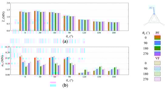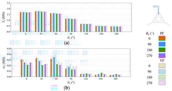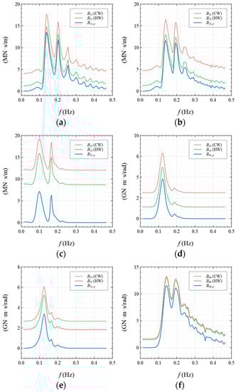 This study estimated the hydrodynamic properties of the Taida platform in the frequency domain from 0 Hz to 0.5 Hz via AQWA. STAR-CCM+ was then employed to obtain the load response of the platform under forced motion in the viscous-flow field to predict the viscous damping. The comparison between the hydrodynamic properties via the PF approach and VF approach (i.e., vs. , and vs. ) is shown in Figure 11 and Figure 12. The mean value of the hydrodynamic properties of the last five periods of a forced motion was employed in the viscous damping prediction, and only the nonnegative predicted result was used.