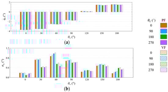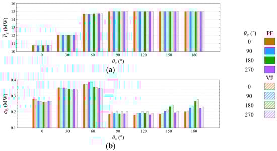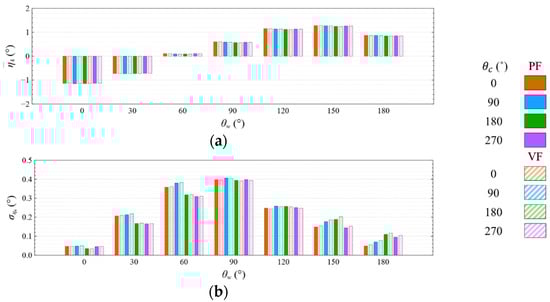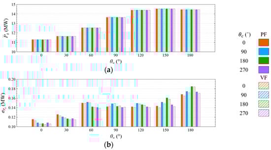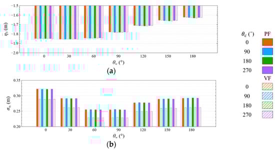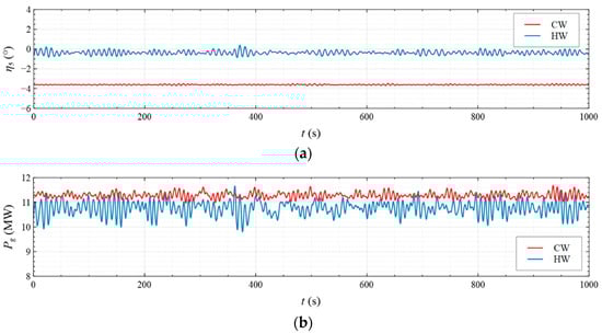 The motion response and generator power were obtained by solving the equations of the motions in OrcaFlex. represents the linear and angular displacement in the 6 dof motions, where refer to the surge, sway, heave, roll, pitch, and yaw motions, respectively. Moreover, because the simulations were conducted under irregular wave conditions in the time domain, the raw data are presented in time series for 1000 s. Figure 13 presents the pitch motion and power output under and , where the red line denotes the CW response, and the blue line represents the HW result. The randomness in the responses as well as the greater fluctuation can be seen in the HW results with different means. The following sections use the means (a bar on the variable) and standard deviations () of the motion response, power output, and mooring line tension to characterize the time-domain results.