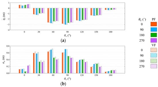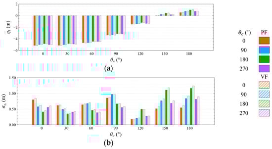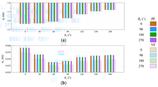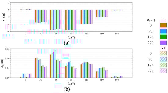 where T denotes the period of motion. The computational domain has a length of , and the overset domain has a length of . For the two wave conditions (i.e., the common wave (CW) condition and high wave (HW) condition), the corresponding zero-crossing periods were 5.5 s and 7.5 s, respectively. Following (A18), the corresponding wave lengths were 48 m and 92 m, respectively. Therefore, the lengths of the computational domain and overset domain of the CW condition were 960 m and 144 m, respectively, and those of the HW condition were 1840 m and 276 m, respectively. The dimensions and boundary conditions of the computational domain are shown in Figure A3.