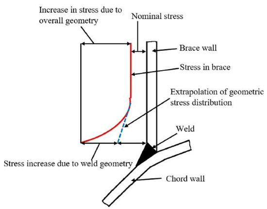 While the nominal member stresses in most tubular structures may be within the allowable stress, the complicated geometry of the tubular joint can lead to considerable stress amplifications [2]. Stress concentration is caused at the interface due to geometry change and weld toe, as presented in Figure 3. Depending on the geometry of joints and the type of applied load, plastic failure of the chord, cracking of the brace-chord weld line, separation of the brace from the chord, cracking of the brace, local buckling, shear failure of the chord between neighboring braces, and lamellar ripping of the chord are typical modes of joint failure. Failure of a typical joint imparts extra load to other nearby structural members and may cause damage to these members, with the subsequent collapse of the whole structure.