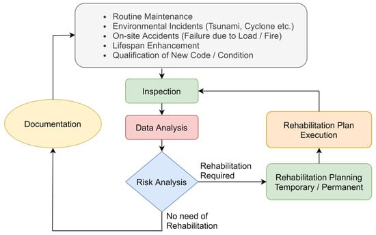 Many oil and gas facilities worldwide were built decades ago and were not intended to be operational today. For example, 64 out of 190 (more than 30%) fixed offshore structures operated in the Malaysian region by PETRONAS had already exceeded their 30-year design life, and 20% will reach their design life in the next five years [4]. As such, a thorough life enhancement study is required to safely use these offshore facilities beyond their design life. As part of a structural inspection program, periodic inspections of offshore joints are usually conducted based on visual inspection and various techniques such as ultrasonic, radiographic, acoustic, eddy current, strain gauges, and vibration monitoring. A detailed risk analysis is carried out for unusual joints. The risk analysis identifies the frequency and consequences of joint failure based on the inspection data. In addition to the inspection data, design specifications, technical drawings, analysis/re-analysis reports, and maintenance and repair records are all considered in risk analysis. Each of these factors needs to be assigned specific weight/importance, and how they correlate plays an important role in decision-making. Based on the risk analysis, joints requiring rehabilitation are identified. The identified risk level is assessed, and temporary or permanent repair is recommended. The typical process of identifying the need for rehabilitation is presented in Figure 4.