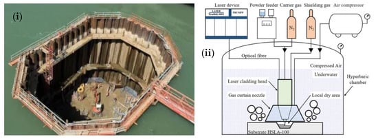 Welding is one of the best rehabilitation procedures that can be quickly utilized for offshore joints. Dry welding can be carried out if the subject joint is exposed to air. It is preferably employed on the topside (offshore deck). Difficulties arise when the welding process is done underwater since it is impossible to replicate the conditions for maintaining high-quality welding with optimal performance. An enclosure, called a cofferdam, is built around the region of interest in water, and water is pumped out. A typical cofferdam is illustrated in Figure 5i. The process of welding in a cofferdam is similar to dry welding in air. However, the cost and time involved in building a cofferdam make this process unfavorable, specifically if the region of interest is substantially deep. For deeply submerged joints, dry welding is carried out using a pressure-regulated enclosure called hyperbaric chambers, as shown in Figure 5ii. The use of a hyperbaric chamber is an expensive option. Wet welding using specialized electrodes is a viable alternative with less cost and time, as a cofferdam or hyperbaric chamber is not required. However, wet welding may produce welds of inferior quality. Wet welding is sensitive to depth, and the rapid cooling in water makes the optimum metallurgical structure very difficult. Pre- and post-weld operations are also less effective in water. While qualified diver welders are required for wet welding, robotic welding has recently been reported for deeply submerged structures [5]. However, the geometric complexity and limited access to the weld line between joint members limit its application for joint rehabilitation.