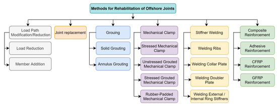 The ability of a joint to bear subjected loads is vital for the safe and continuous operation of the facility. Excessive operational loads, cyclones, and tsunamis can cause fatigue damage to the joint, while material and construction flaws reduce the load capacity of the joint. Third-party damages caused by object drop and collision with vehicles during installations, inspection, or hostile strikes can damage structural joints. Additionally, corrosion, an obvious process in the humid offshore climate, is a major cause of pipeline failure. It degrades the joints by thinning the walls, causing stress concentration at the affected zone and modifying the nearby stress and strain field. Corrosion diminishes the load capacity of the joint and thus the whole structure. Reinforcing these critical joints may be necessary to regain or increase the load capacity or rectify the damage. Besides analytical calculations for simple joints, complex tubular joints are analyzed using numerical methods (such as finite element analysis) or experimentation. Various researchers have investigated the joint reinforcement methods, and some have developed mathematical models based on the data obtained in numerical or experimental studies. A single article accumulating the famous techniques for joint rehabilitation was missing in the literature. This article reviews the advantages and disadvantages of the various tubular joint rehabilitation techniques commonly employed in the offshore sector. A viable alternative to conventional methods, FRP reinforcement, is explored, and the challenges in its application to offshore tubular joints are discussed. This article presents a quick overview of the techniques and may help better rehabilitation method selection. Due to extensive utilizations and various configurations, stiffener welding and composites have been discussed in more detail than other options.
